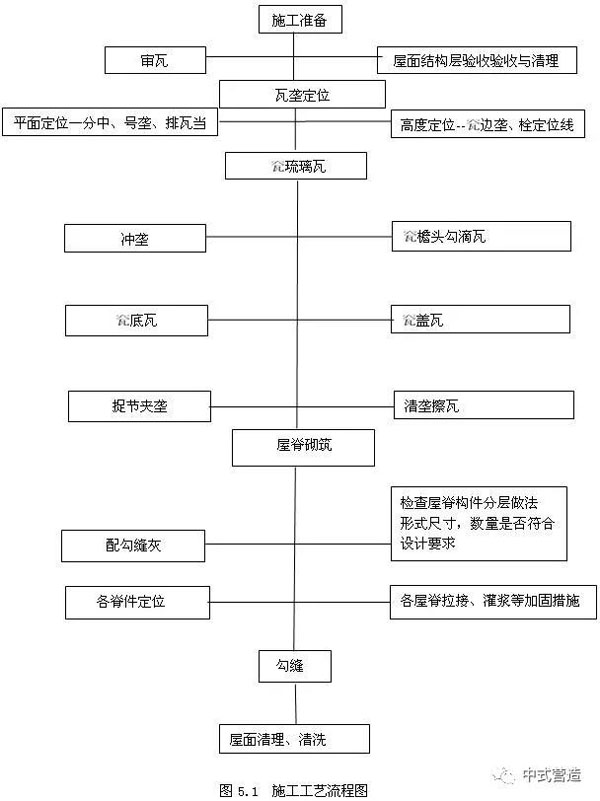 2.0.2 采用本工法施工易于保證琉璃瓦的鋪設(shè)質(zhì)量,能確保瓦件鋪設(shè)的安全性、牢固性,施工完后的琉璃瓦屋面拼接緊湊,搭接嚴(yán)密,屋脊、檐溝順直,屋面防水效果好,成型后的觀感質(zhì)量很好。