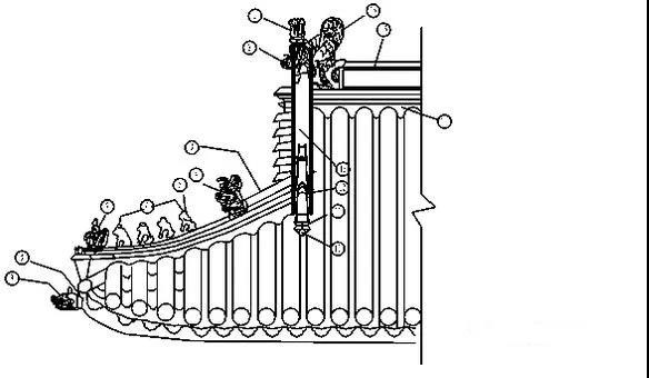 ①-劍把 ②-背獸 ③-戧脊獸后 ④-戧獸 ⑤-戧脊獸后 ⑥-各樣走獸