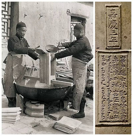 右圖瓦身背面有上下兩個(gè)長(zhǎng)方形的戳記,上面的戳記寫著“嘉慶三年”,下面的寫著“窯戶趙士林、配色徐孟壽、房頭陳千祥、窯匠許萬(wàn)祥”,旁邊尚有滿文對(duì)照。戳記除了說(shuō)明琉璃的燒造年代,還證明琉璃渠官窯燒造有著明確的分工以及責(zé)任追認(rèn)制度。