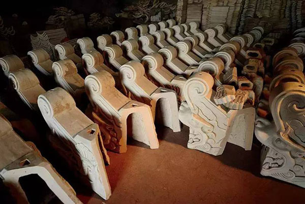 官式建筑琉璃瓦要經(jīng)過(guò)二次燒成,原料精純的坯胎第一次燒出的顏色呈微黃的白色,這樣可以最好地呈現(xiàn)出釉料色澤的純凈。圖中這組吻獸構(gòu)件剛結(jié)束第一次的燒制,等待施釉重生。
